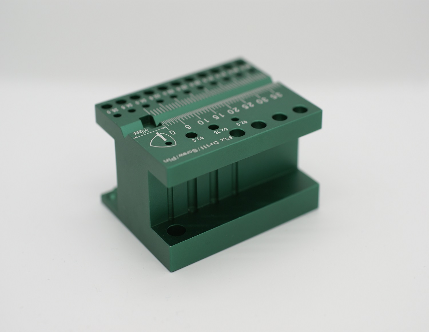 The drill can be placed horizontally for visual positioning using the scale, and the ruler box is designed to allow easy depth adjustment by simply inserting it into vertical holes of varying depths in a stair-shaped pattern. The contrast between the vivid dark green color of the oxidative coloring and the white scale also enhances visibility.